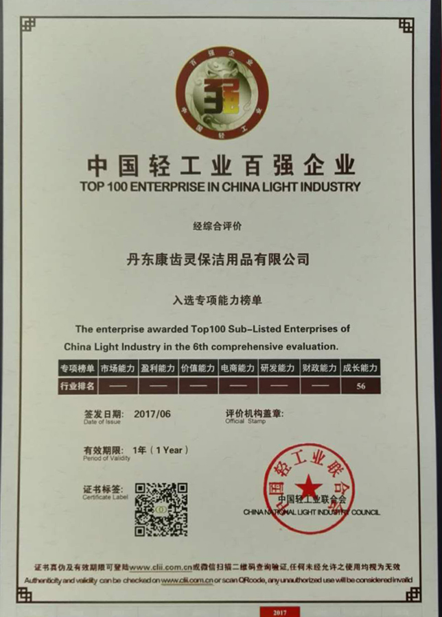 恭喜丹東欣時代生物醫藥科技有限公司(原丹東康齒靈保潔用品有限公司)榮獲2017年度中國輕工業百強企業。